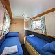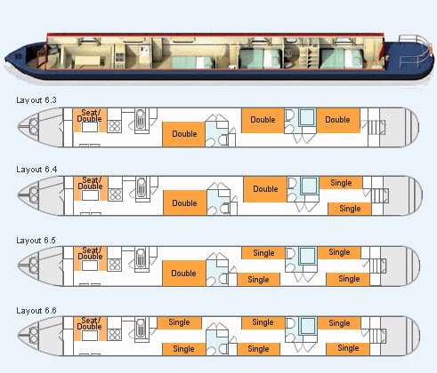 Cabins: Three cabins, all with flexible layouts of either one permanent double or two singles in each. Double beds measure 6'3" x 4' with interior sprung mattresses. Single beds measure 6'3" x2' with interior sprung mattresses.