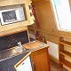 Galley: Domestic-sized gas cooker with a 2 shelf oven and grill, separate 4-ring gas hob, microwave oven, domestic sized fridge with small freezer compartment fitted under work top. Galley is fully equipped to suit the maximum capacity of 5 crew.