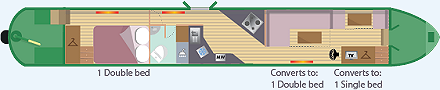 Highlights: A semi traditional stern narrowboat favoured by couples as well as young families. Plenty of storage space provided. 240 volt electrical systems with several 3-pin sockets. Hairdryer provided. The bow deck offers a social area where on-board folding chairs can be placed. Only 2 bicycles are allowed on the boat and these must be stored on the roof, cushioned with rugs or blankets and secured by yourselves, thank you (please advise us at the time of booking if you are planning to bring bikes).