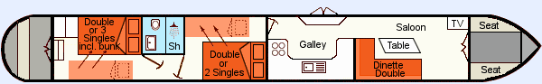Cabins: Two cabins both flexible with either two singles (rear cabin single bunks) or a permanent double.