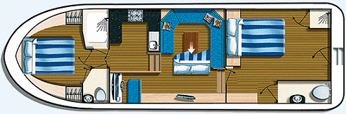 Cabins: Two en-suite cabins. The forward cabin has a flexible layout and can either be configured as a double or twin with sprung mattresses. The rear cabin has a permanent double bed with plenty of storage. Both en-suites have a flush toilet, wash basin and seperate shower cubicle.