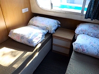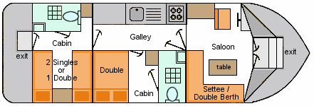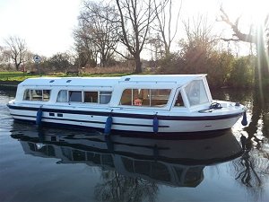 Facilities: A spacious budget cruiser with large picture windows providing excellent visability and plenty of light, and offers a choice of two doubles plus two singles or three double beds in two cabins plus the saloon. Combi TV/DVD, CD/radio player. Aft access for easy mooring. 240v Electrics with standard 3 pin sockets, maximum 2kW. Hair dryer available on arrival. Mobile phone friendly - please bring own lead.