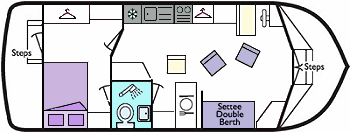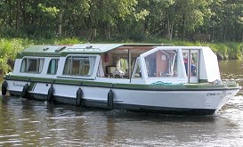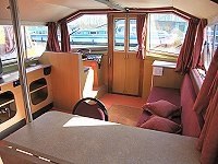 Facilities: Spacious and elegant cruiser with sliding canopy over saloon for open air cruising. Forward drive with single floor level throughout. Large picture windows. Aft access for easy mooring. Well equipped galley with all facilities. Fully carpeted in living areas. Warm air heating.