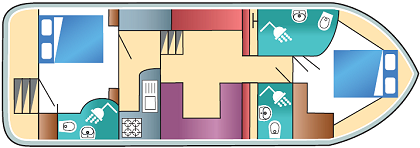 Featuring hydraulic bow and stern thrusters for ease of movement. An external upper sundeck with integral sunbathing platforms and alfresco dining area (dinette area, seats with cushioned backrests and removable table) perfect for entertaining. Stylishly appointed saloon with raised steering position and additional forward facing seating so that all crew can enjoy the visibility of the helmsman. Saloon seating converts to provide an additional double bed, if required. There are two spacious double cabins with island beds and luxury en-suite shower rooms. Warm air heating (heating is diesel fired, the batteries must be topped up before switching on for the heating to work (normal running 5 – 6 hours a day should suffice) and then the boat can stay warm for up to 5 hours in the evenings when the engine is not running).